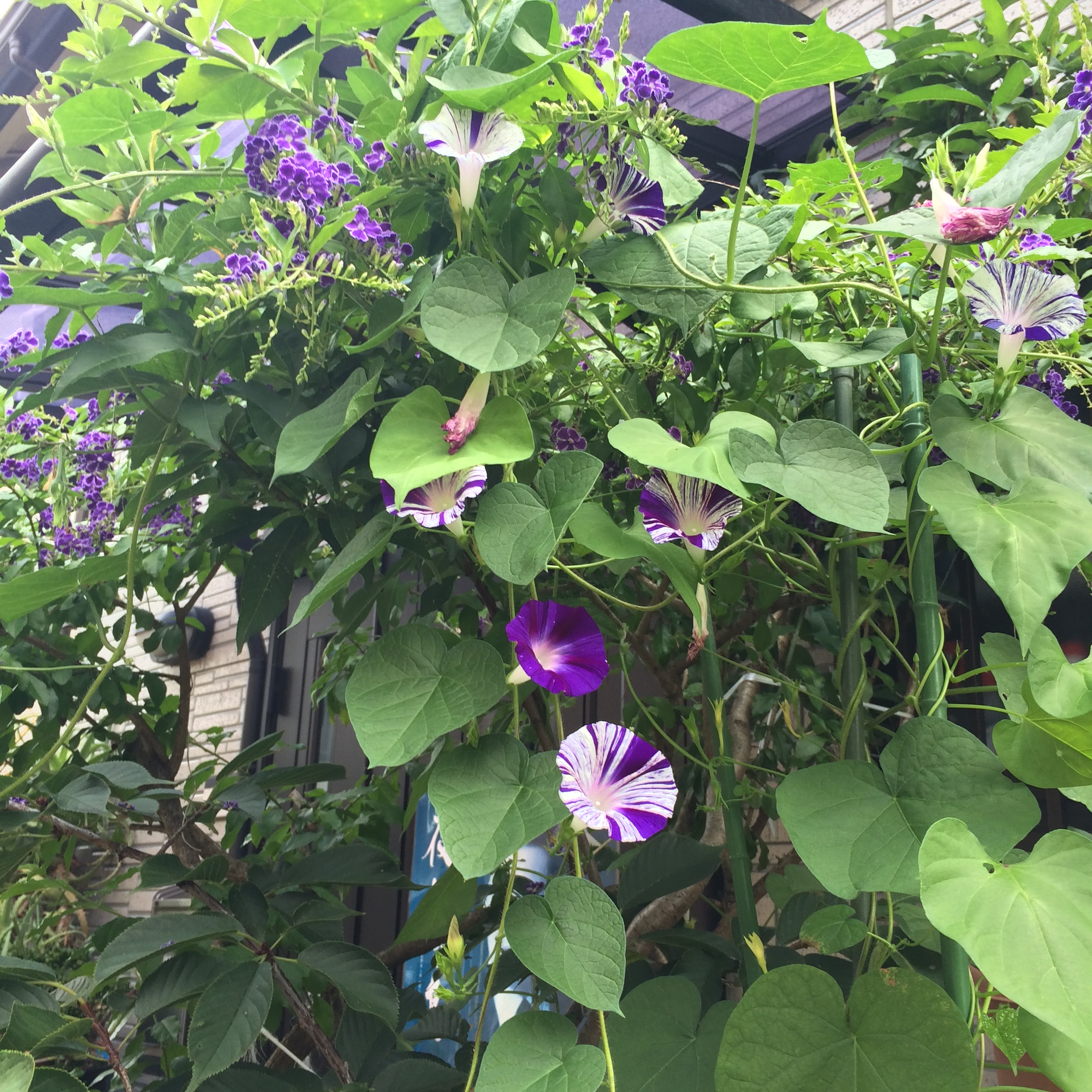 目黒で通りすがりに、涼を呼ぶ朝顔をみつけました。上手にグリーンカーテンにしています。